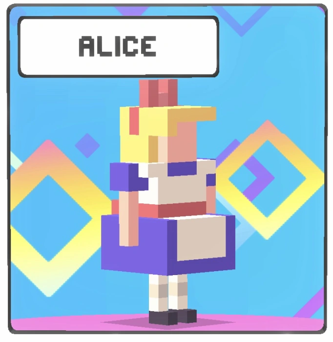 Alice is a playable mascot in Crossy Road, released in the Candy update.